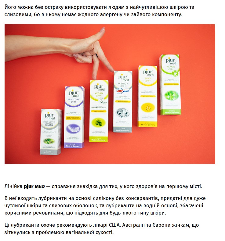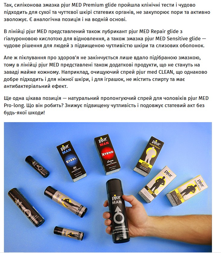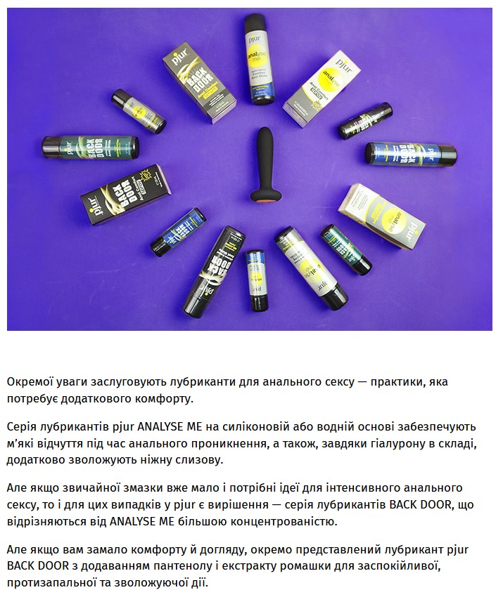 Что может быть общего между этими понятиями? Об этом вам расскажет статья, которую опубликовали на сайте tabloid.pravda.com.ua. Публикация детально знакомит со всеми линейками бренда pjur. Подскажет вам, какой лучше лубрикант посоветовать клиенту для его любимой игрушки или для активного анального секса. Ваш арсенал аргументов в пользу pjur пополнится информацией о наградах бренда и его производстве, о применении интимной косметики не только в сексе, но и как средства борьбы с сухостью вульвы и влагалища.