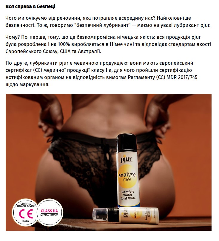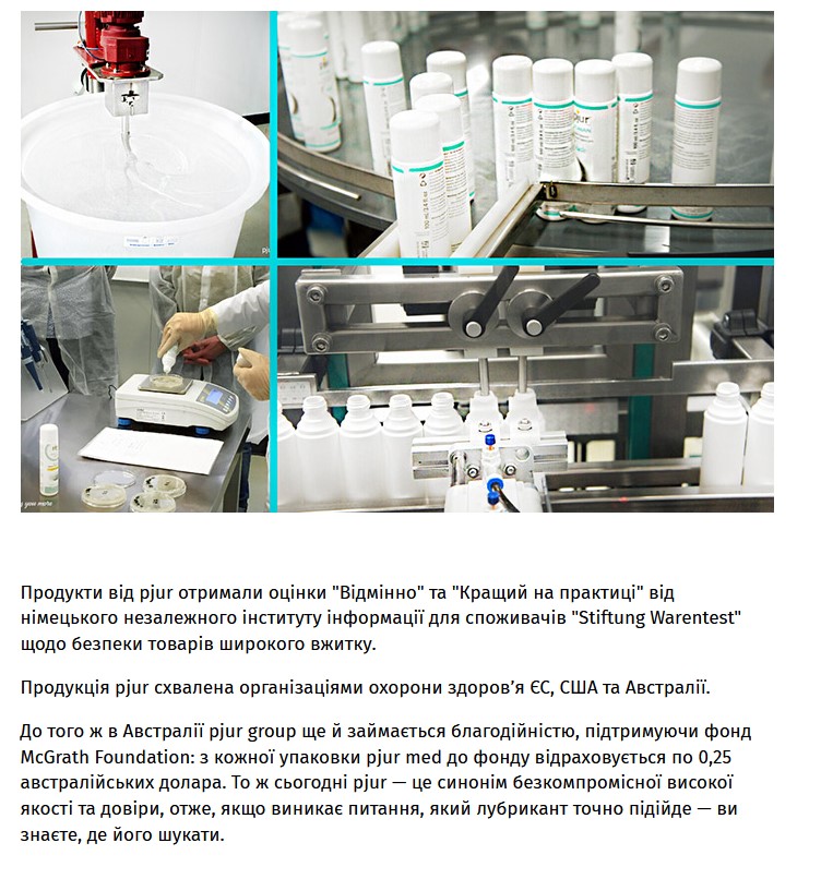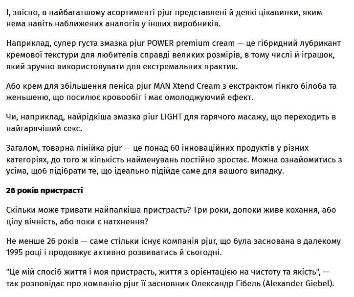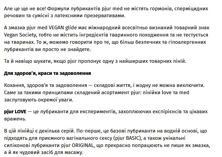 Тщательно собранная нами в статье информация о pjur станет отличным контентом для ваших блогов и новостных страниц на сайтах или постов в соцсетях. В статье не упоминаются никакие интернет-магазины, потому можете смело делиться публикацией и размещать изложенную информацию на своих ресурсах. Статья без внешних ссылок!