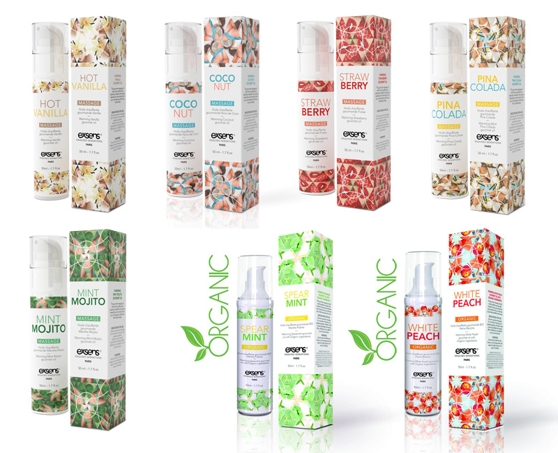 Масло для массажа с приятным вкусом и согревающим эффектом без горького привкуса, без сахара, без парабенов и без феноксиэтанола. Два масла этой серии имеют пометку "Organic" и содержат более 90% ингредиентов из органического сельского хозяйства.