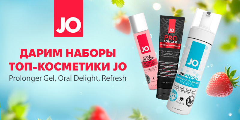JO REFRESH — мягкая пенка для быстрой очистки игрушек за 5–10 секунд. Без триклозана и парабенов, подходит для любых материалов. JO Prolonger Gel — гель с натуральными компонентами для замедления эякуляции и легкого эффекта набухания. Без парабенов и лидокаина. JO ORAL DELIGHT Strawberry Sensation — гель для оральных ласк с клубничным вкусом и эффектом тепло-холод. Усиливает чувствительность клитора и пениса. Без парабенов и L-аргинина.