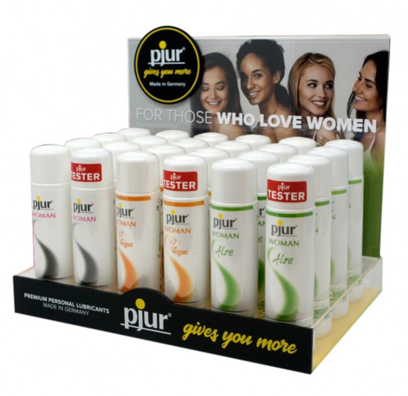 Этот набор смазок Pjur Woman с дисплеем, тестерами и буклетами идеально подходит для вашего магазина, если вы хотите продемонстрировать безопасные лубриканты для женщин . Эти лубриканты были разработаны специально для женщин. Они обладают чрезвычайно длительным эффектом скольжения, оставляя на коже ощущение шелковистой мягкости. Pjur Woman - это лубрикант на силиконовой основе, pjur Woman Aloe - лубрикант на водной основе с экстрактами Алоэ Вера, а pjur Woman Nude - лубрикант на водной основе, но без каких-либо добавок.