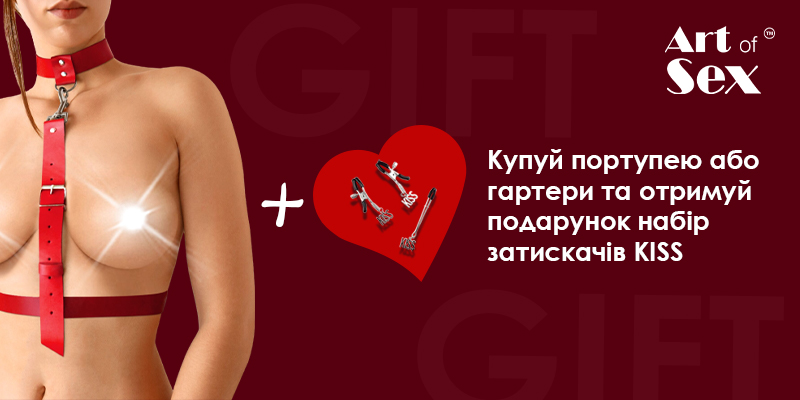 Акція від українського бренду Art of Sex діє до 24 вересня включно. Ще є час нагадати своїм клієнтам про чуттєвий подарунок за умови купівлі портупей і гартерів із наведеного нижче списку. Подарунок — затискачі для сосків і клітора KISS — додається до кожної купленої одиниці товару, що бере участь в акції.