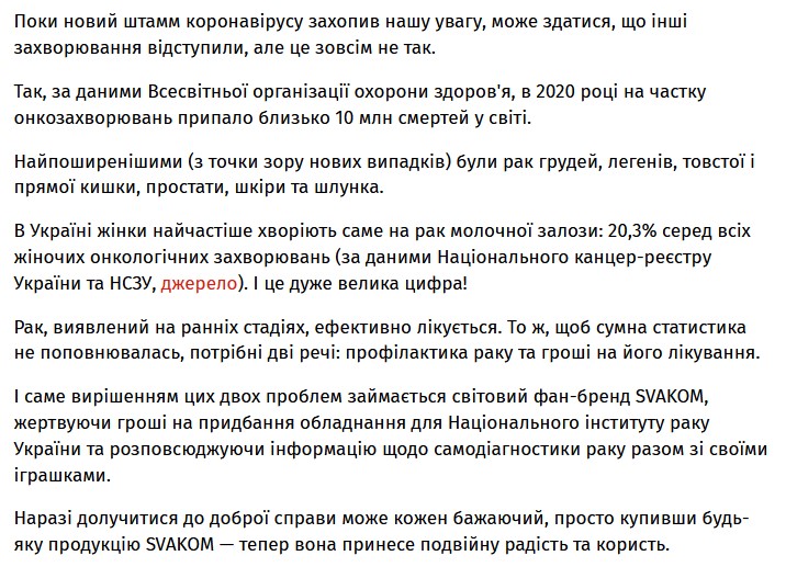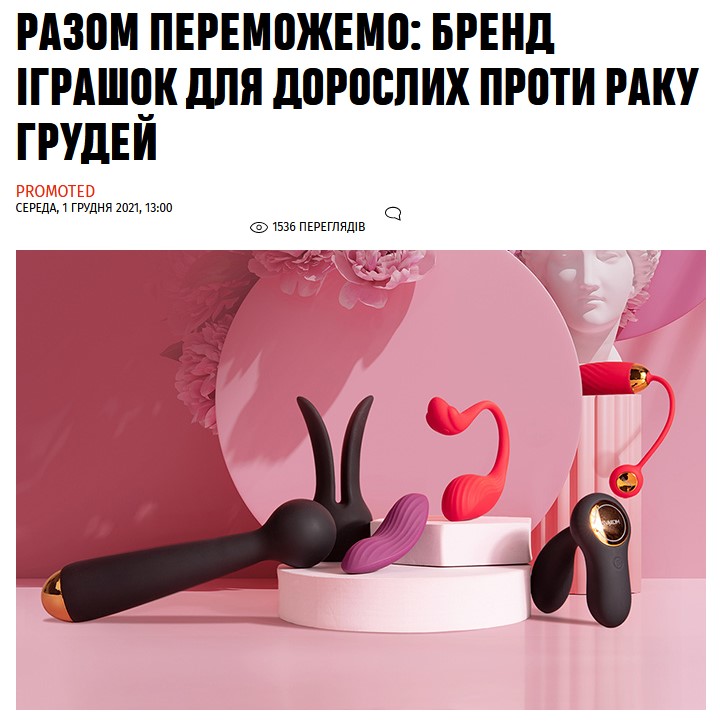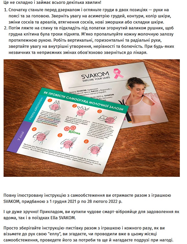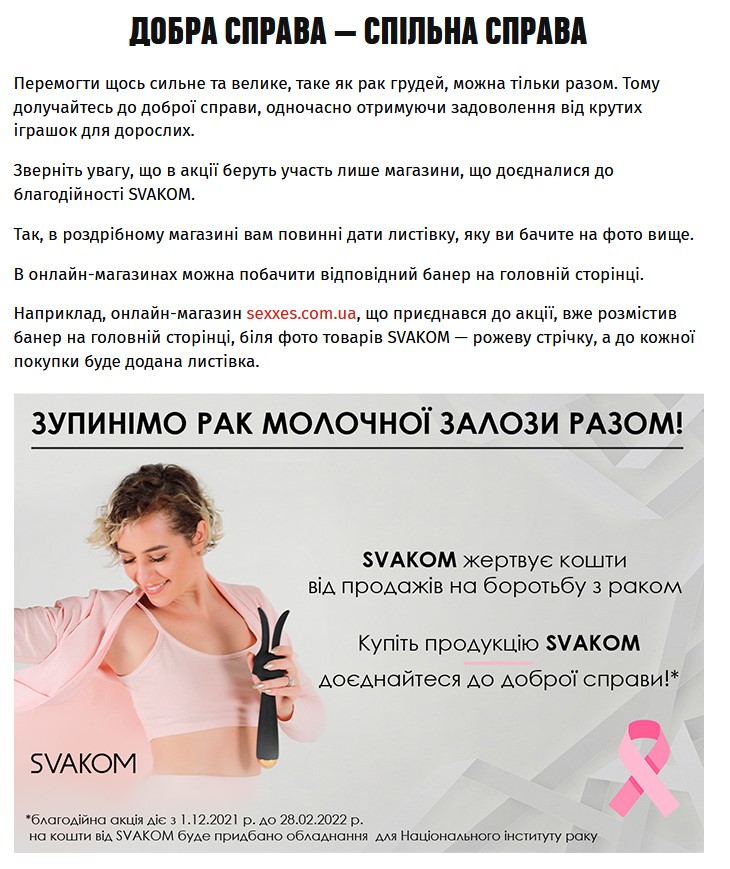 Як ви вже знаєте, фан-бренд SVAKOM став офіційним партнером благодійного фонду КВІТНА та з 1 грудня запустив благодійну акцію, метою якої є збір коштів на придбання медичного обладнання для Національного інституту раку України та запобігання розвитку раку молочної залози.
