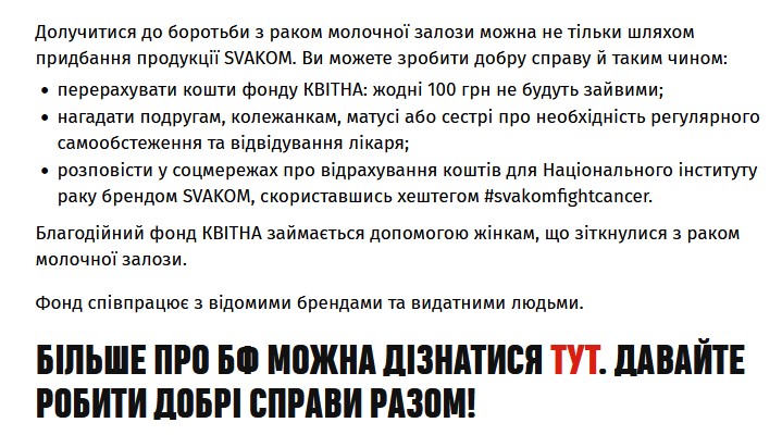Ви також можете зробити свій внесок, розмістивши інформацію зі статті на вашому сайті та соціальних сторінках. Обов'язково використовуйте хештег #svakomfightcancer у Instagram.