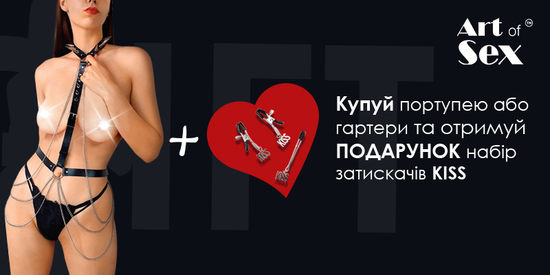 Раді повідомити вас про нову акцію, яка розширює межі задоволення, від українського бренду Art of Sex. Під час купівлі акційних моделей гартерів та портупей даруємо затискачі для сосків та клітора KISS.