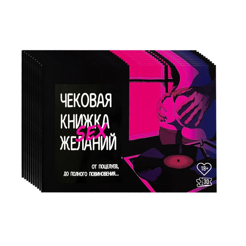 Чекова книжка SEX бажань - це 30 чеків самих різних сексуальних фантазій і бажань, які урізноманітнюють ваше інтимне життя. Це мабуть, найкращий подарунок для обох партнерів, так як обидві сторони залишаться задоволеними. Слоган книжки звучить так "від поцілунків, до повної покори ..." Доведіть, що заради своєї коханої людини ви готові пройти цей шлях.