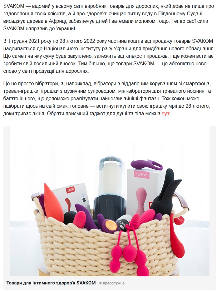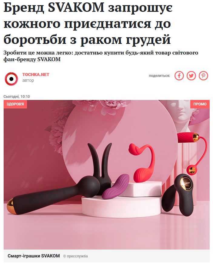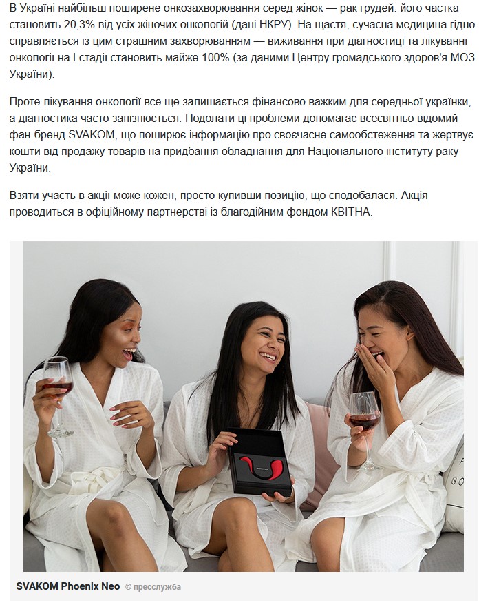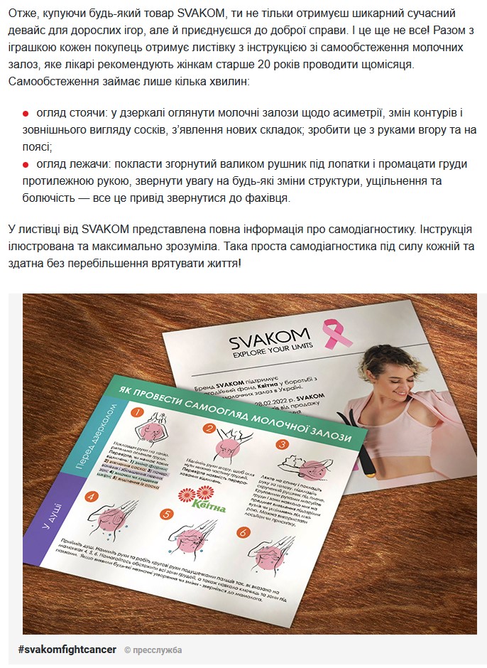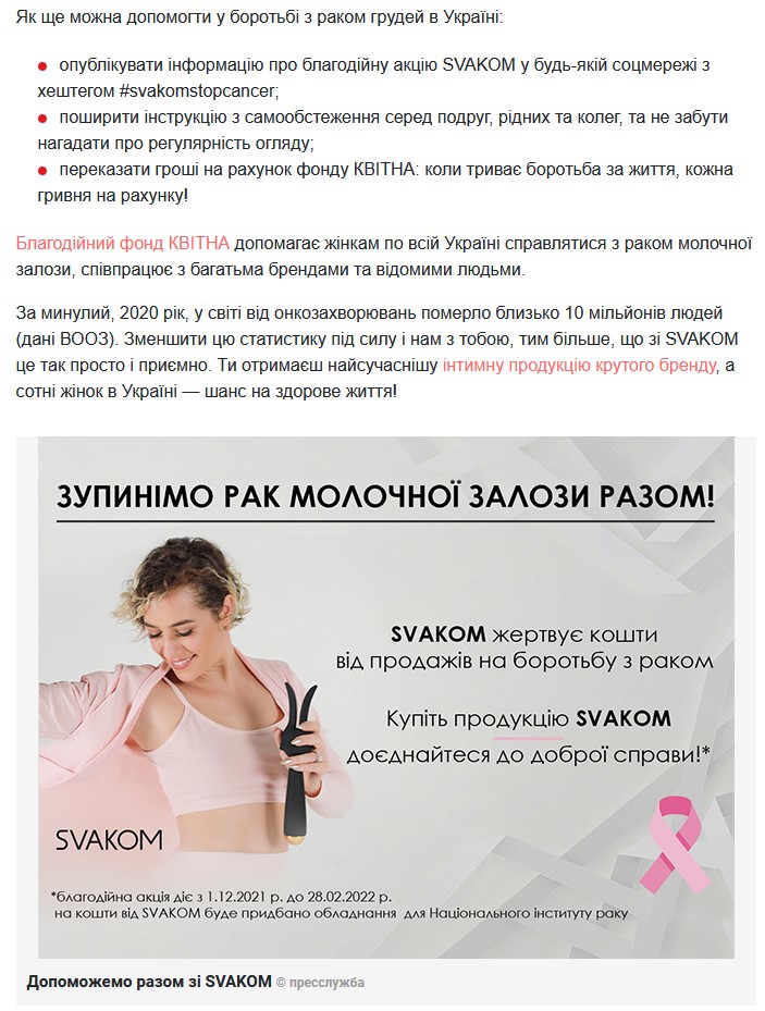 Ми вже писали про те, що фан-бренд SVAKOM став офіційним партнером благодійного фонду КВІТНА та з 1 грудня запустив благодійну акцію. І зараз до підтримки цієї акції та її популяризації серед активних користувачів інтернету, активно підключаються й онлайн-ЗМІ. На одному з популярних інтернет-порталів сьогодні розмістили статтю про благодійність SVAKOM: https://lady.tochka.net/94112-brend-svakom-priglashaet-kazhdogo-prisoedinitsya-k-borbe-s-rakom-grudi/