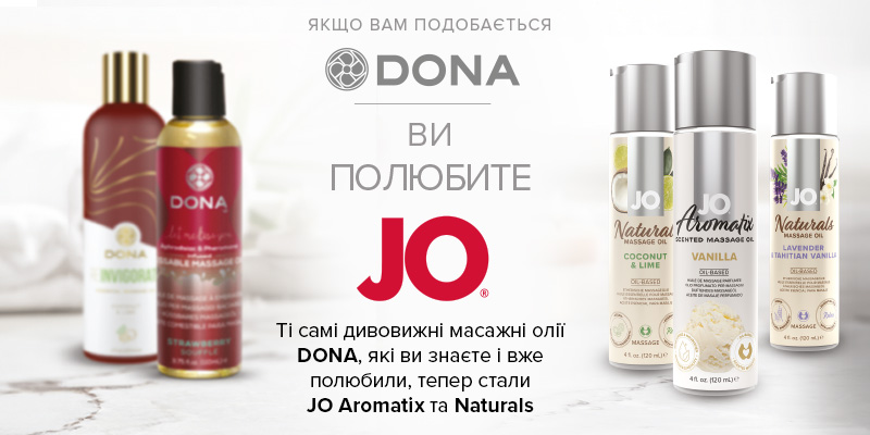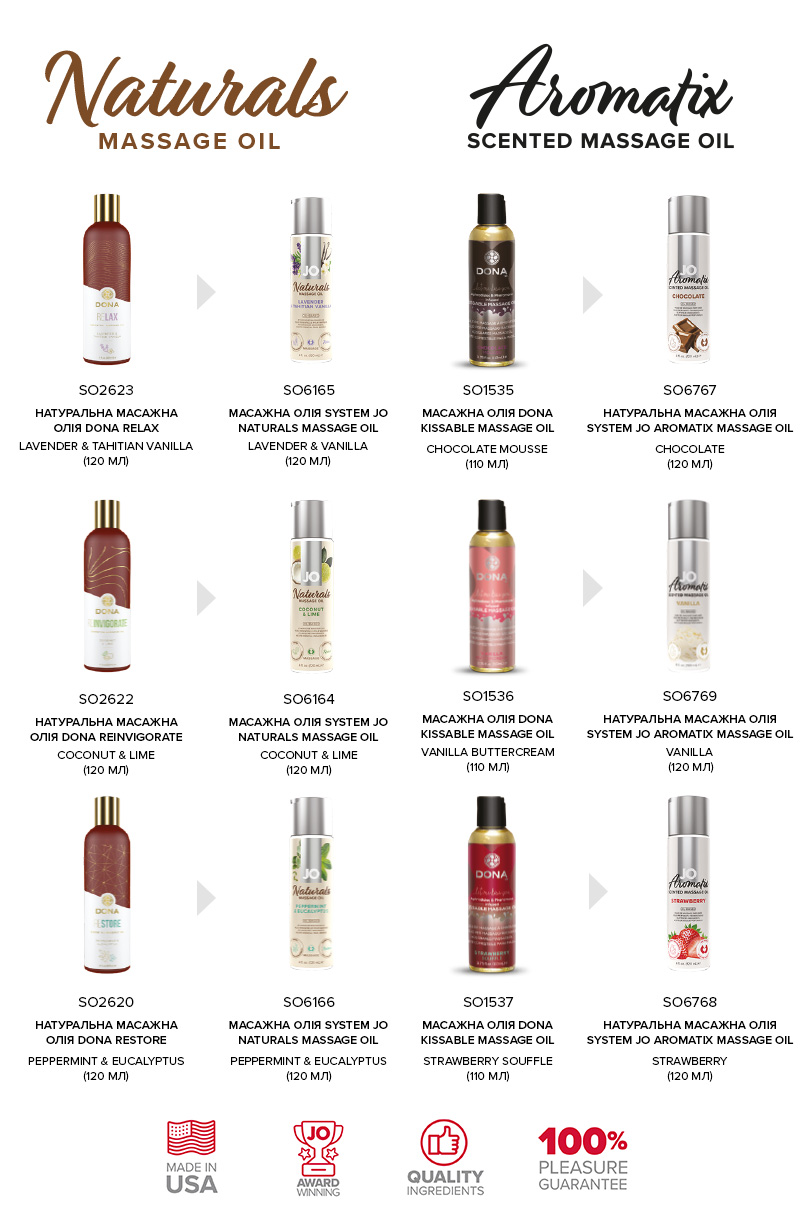 Той самий склад, той самий розкішний аромат, таке ж чудове ковзання — нова лінійка масажних олій System JO Aromatix та Naturals тепер замінить олії, що випускалися під брендом Dona. Тепер ця продукція розфасована в більш сучасне паковання, що відповідає єдиній стилістиці всієї продукції System JO.