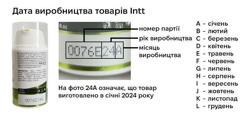 Представники бренду intt пояснили, як визначити дату виготовлення будь-якої продукції intt на пакованні. Дату виготовлення зашифровано в номері партії товару, що нанесено на паковання.