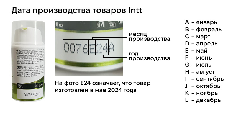 Мы получили официальное письмо от представителей бренда intt с уточнениями относительно определения даты изготовления и срока годности продукции intt. Главное уточнение — расположение буквы, обозначающей месяц изготовления, в коде партии. Изначально было заявлено, что месяц изготовления — это последний символ в коде партии. По уточненной информации, месяц изготовления означает пятый символ в коде партии, перед цифрами года. Далее приводим содержание письма производителя. Скачать оригинал на английском можно по ссылке.